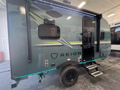 The Reign travel trailers by Keystone are premium single-axle units that are sure to make an impression at the campground. Each one is built with an exclusive automotive-finished aluminum exterior, a walkable roof, and a 100% composite floor for added durability. There are also tinted safety glass windows, quick drop stabilizer jacks, and an exterior shower with hot and cold water. The European inspired interior design is unique and cozy, and the 78" interior height will give you plenty of space to move about. You will also enjoy the ultra bright LED light strip and solid surface countertops in the kitchen, along with blackout night shades, and many more interior comforts.